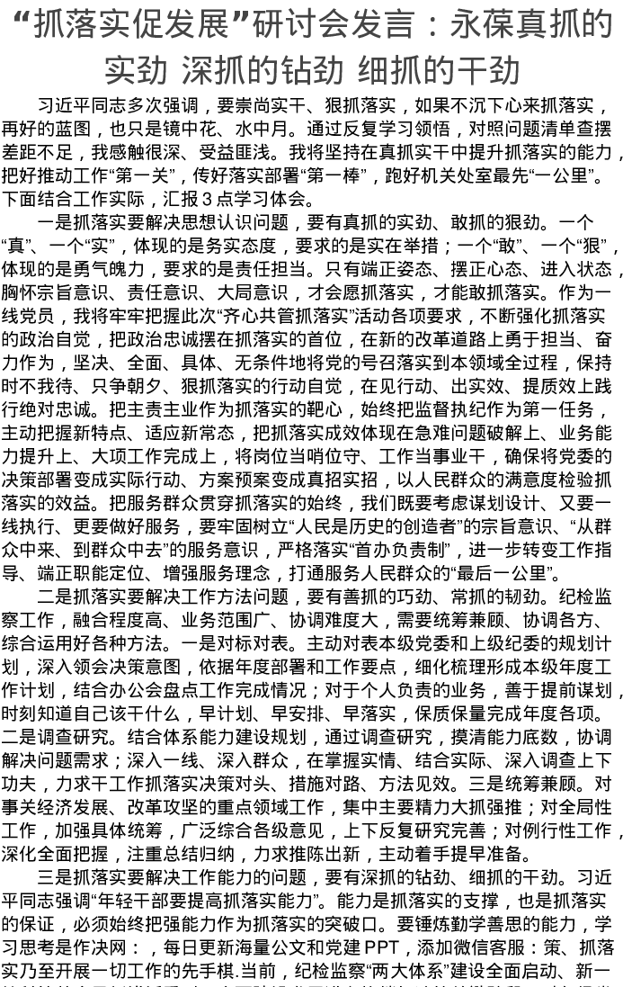 “抓落实促发展”研讨会发言永葆真抓的实劲深抓的钻劲细抓的干劲