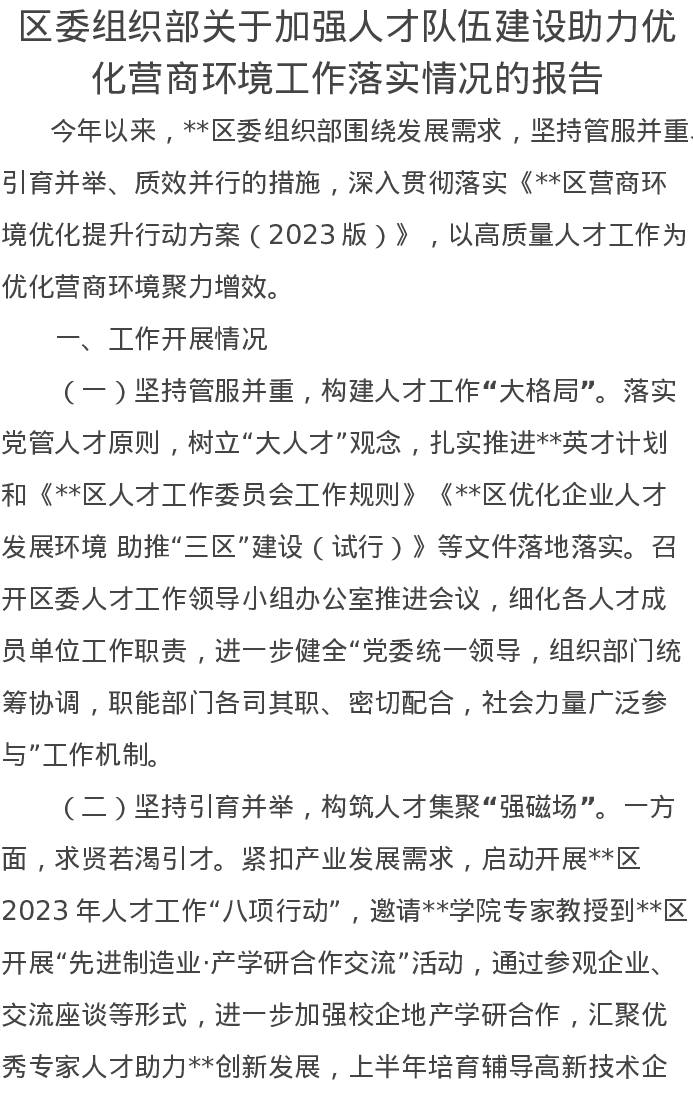 区委组织部关于加强人才队伍建设助力优化营商环境工作落实情况的报告