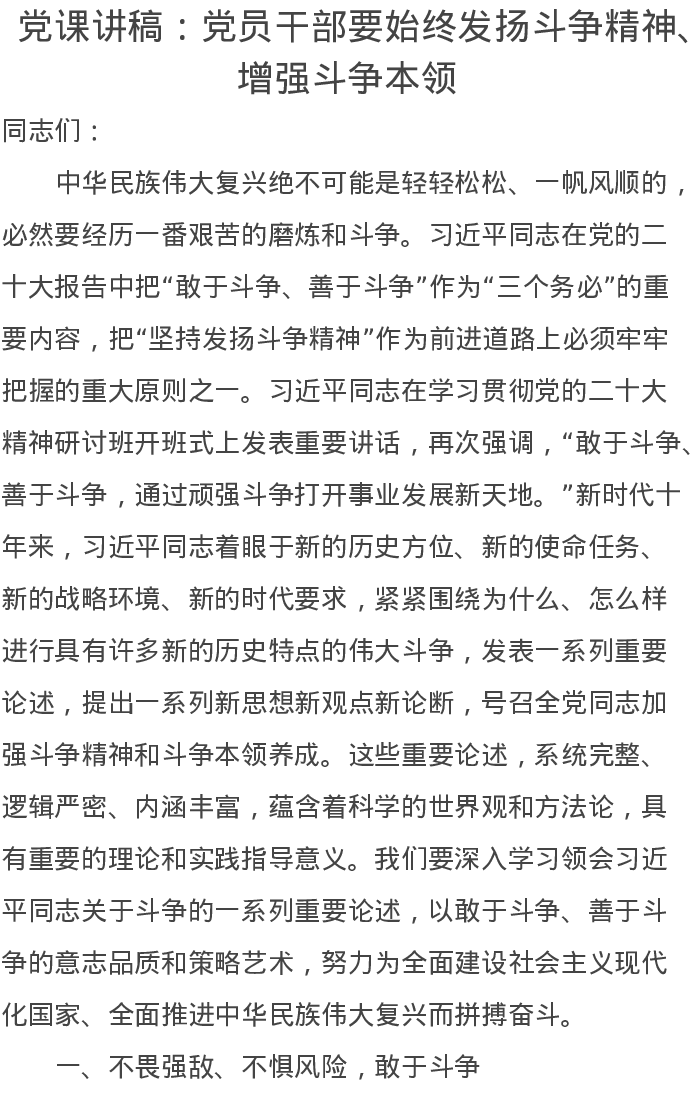 党课讲稿:党员干部要始终发扬斗争精神、增强斗争本领