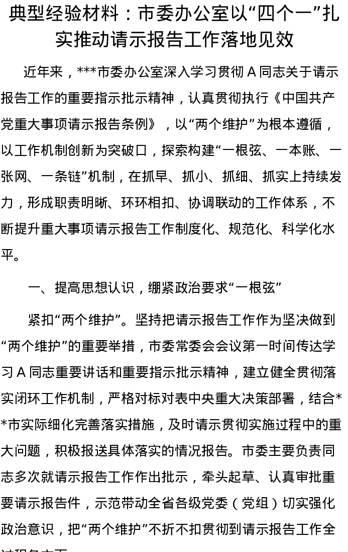 典型经验材料:市委办公室以“四个一”扎实推动请示报告工作落地见效