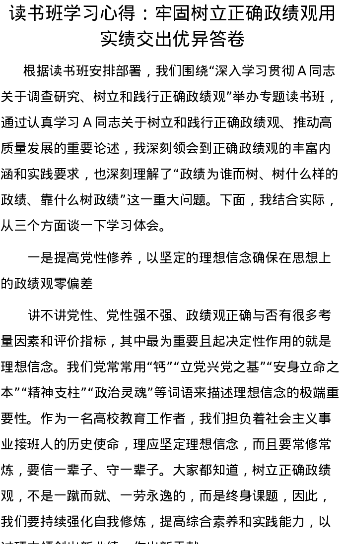 读书班学习心得:牢固树立正确政绩观用实绩交出优异答卷