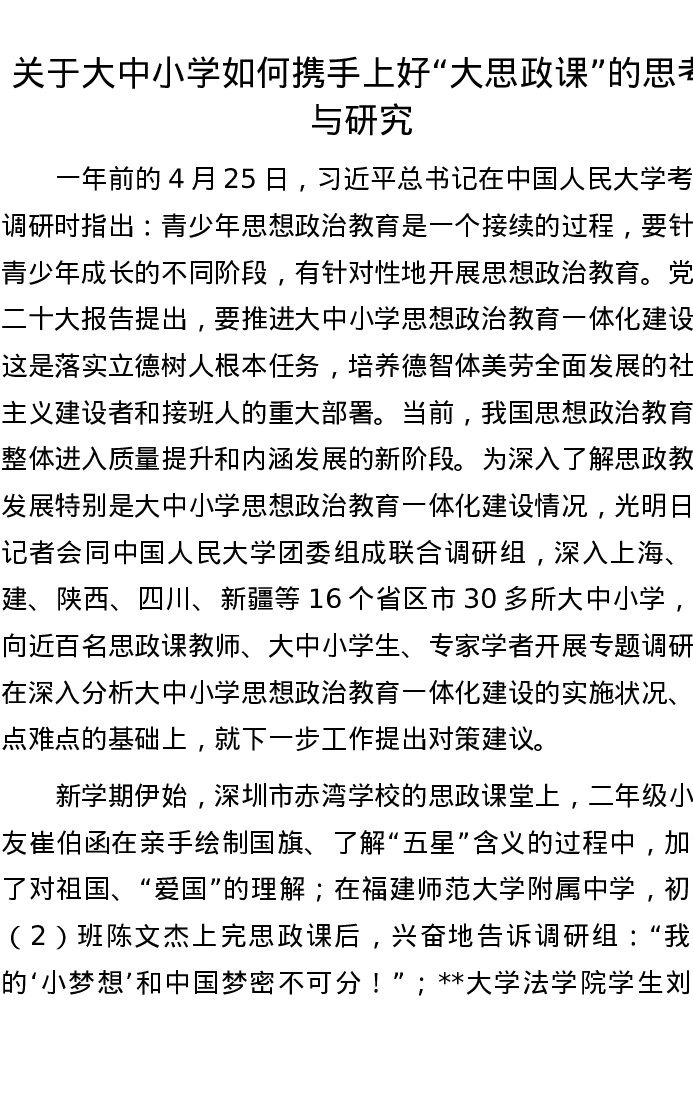关于大中小学如何携手上好“大思政课”的思考与研究