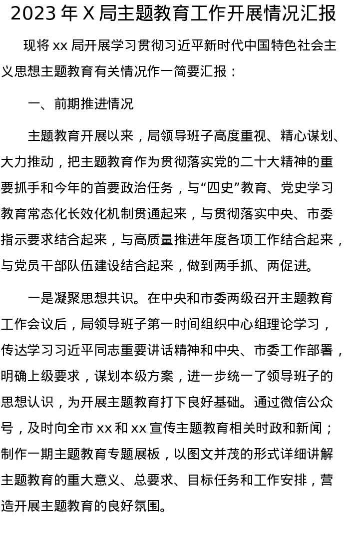 2023年X局主题教育工作开展情况汇报(特色社会主义思想)