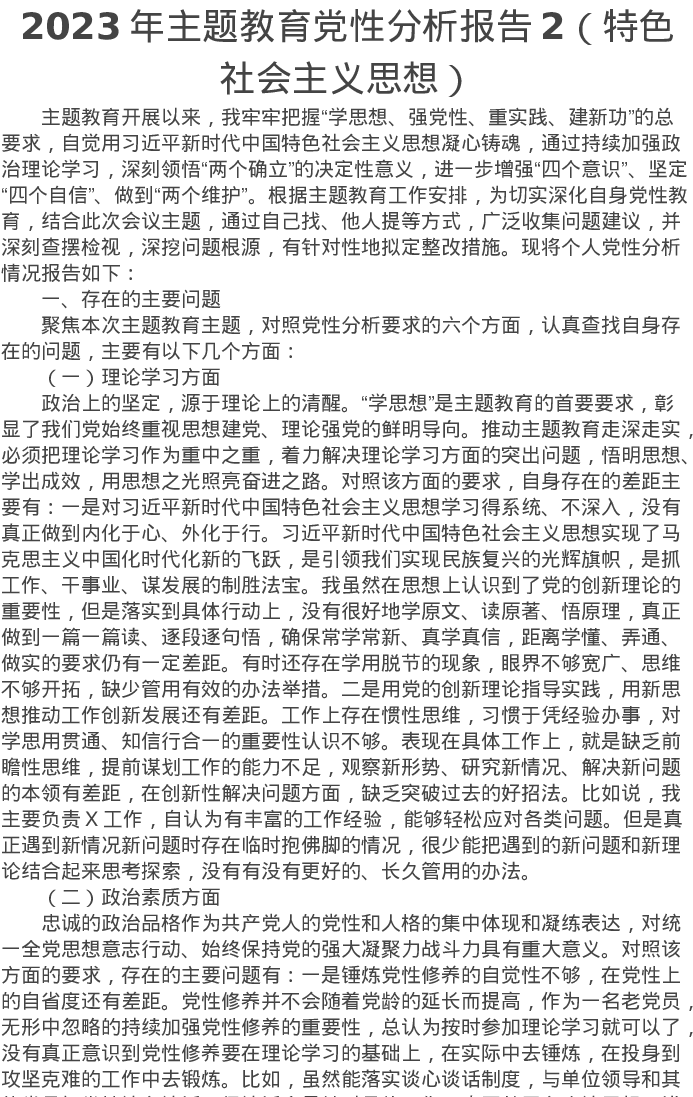 2023年主题教育党性分析报告2(特色社会主义思想)