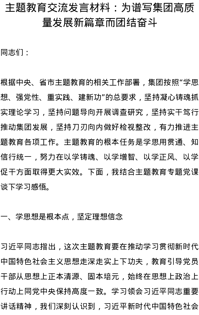 主题教育交流发言材料:为谱写集团高质量发展新篇章而团结奋斗(特色社会主义思想)