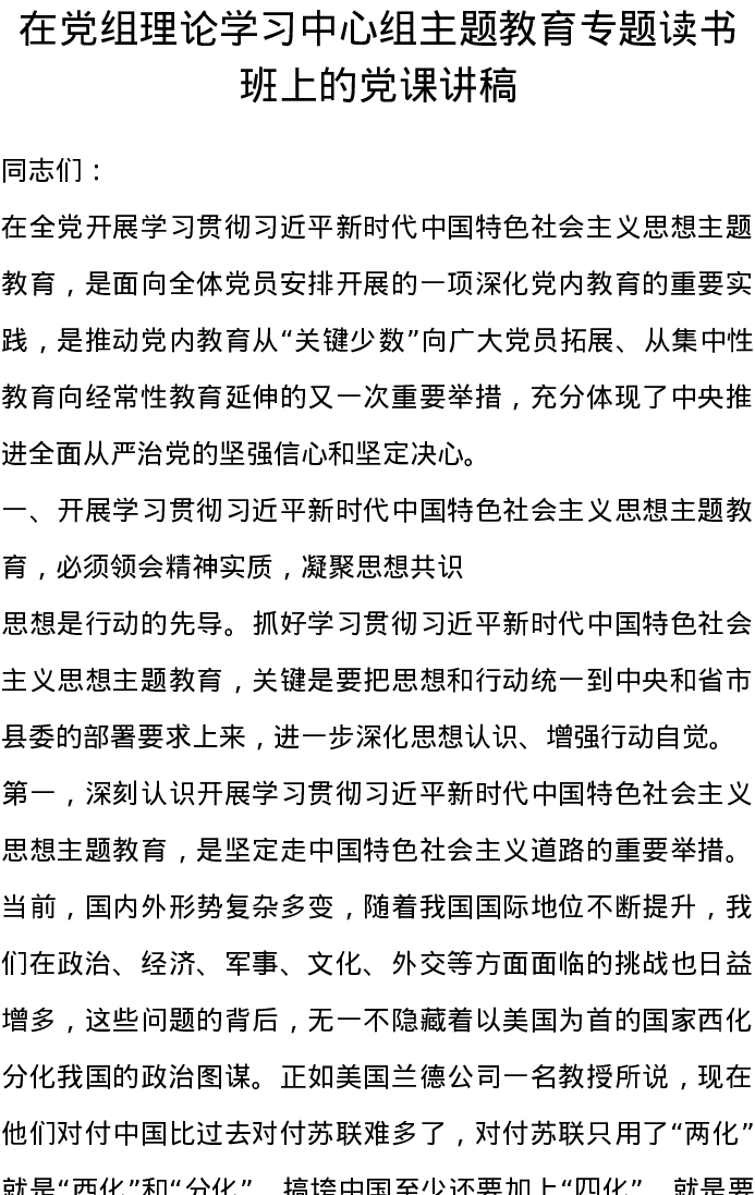 在党组理论学习中心组主题教育专题读书班上的党课讲稿(特色社会主义思想)