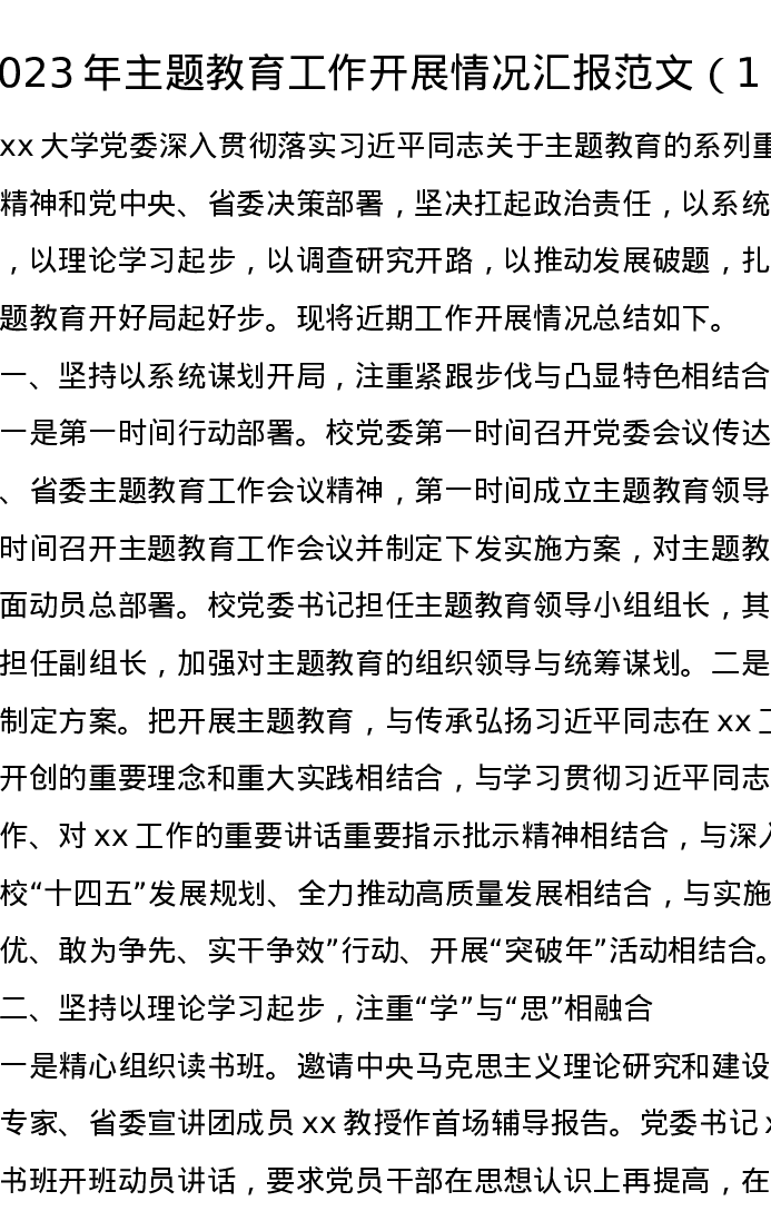 汇编:主题教育工作汇报2篇(特色社会主义思想)