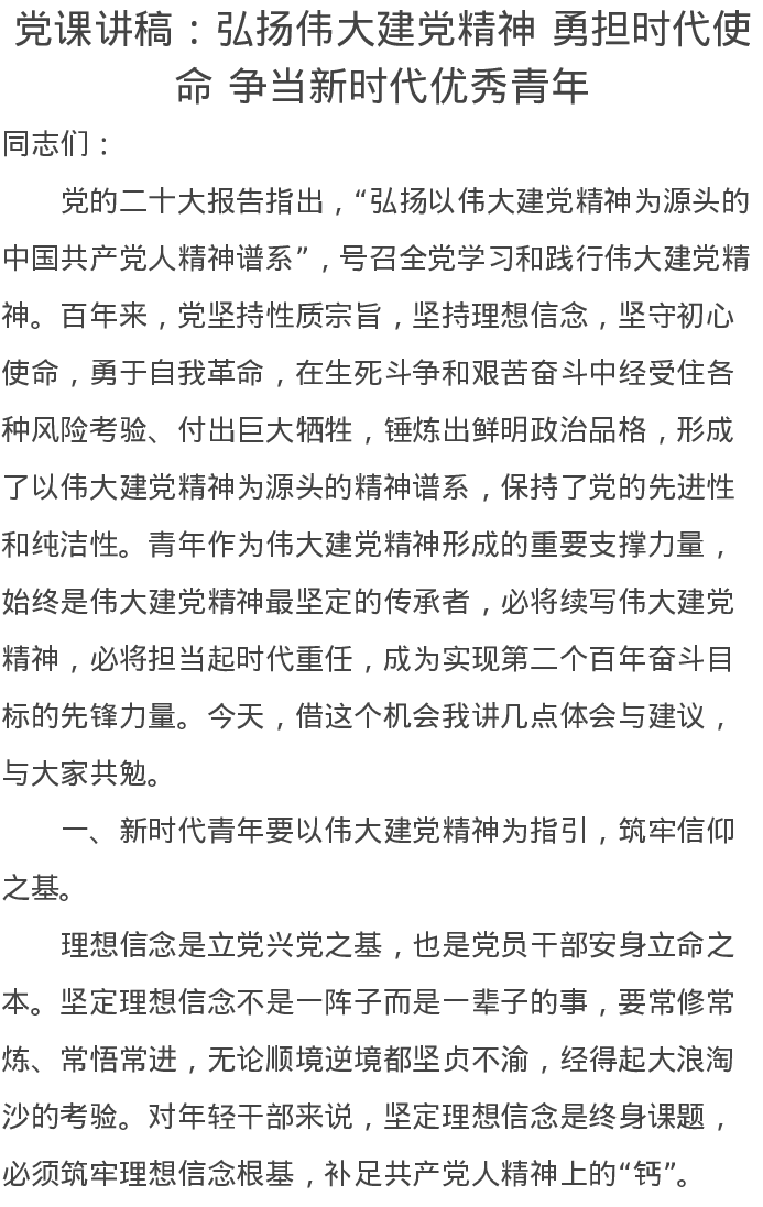 党课讲稿弘扬伟大建党精神 勇担时代使命争当新时代优秀青年