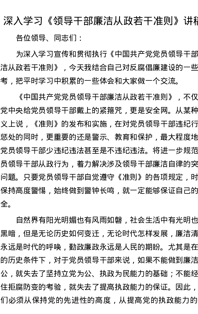深入学习《领导干部廉洁从政若干准则》讲稿