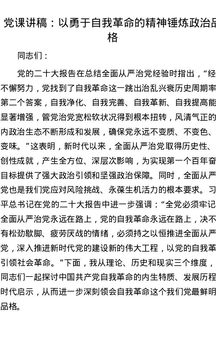 党课讲稿:以勇于自我革命的精神锤炼政治品格