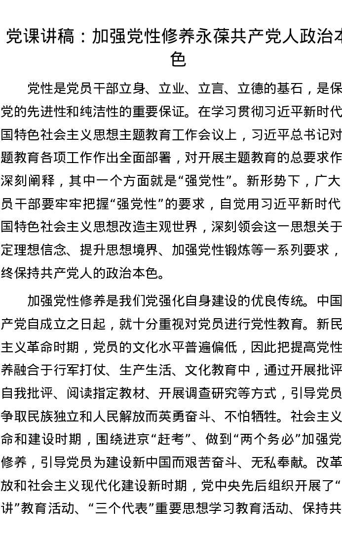 党课讲稿:加强党性修养 永葆共产党人政治本色