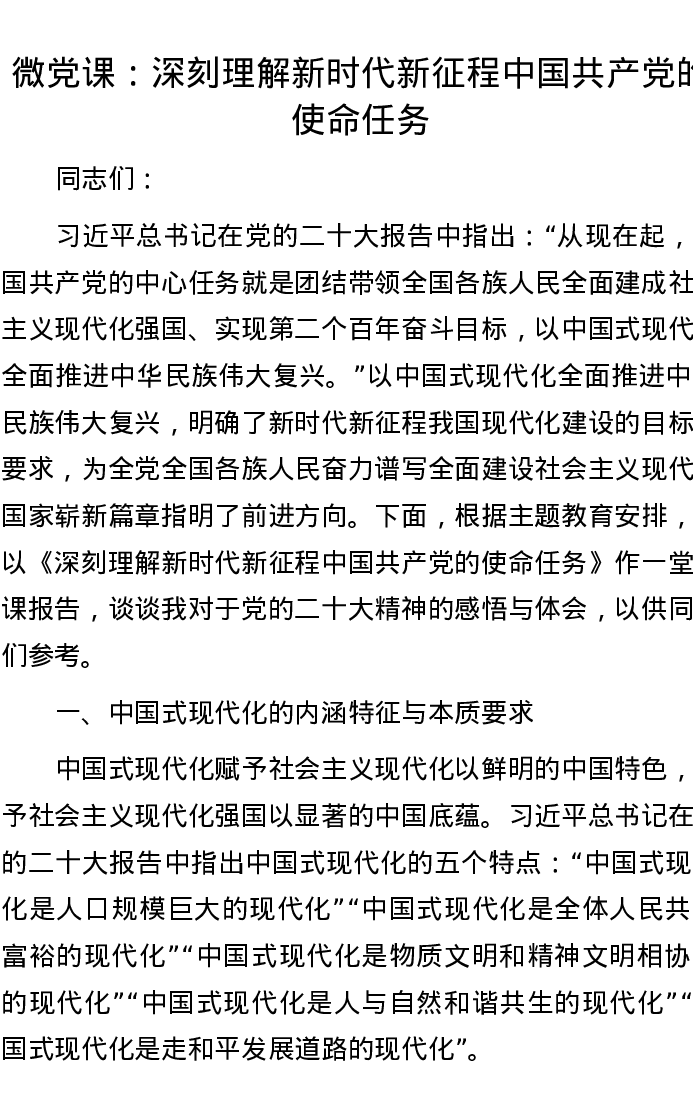 微党课:深刻理解新时代新征程中国共产党的使命任务