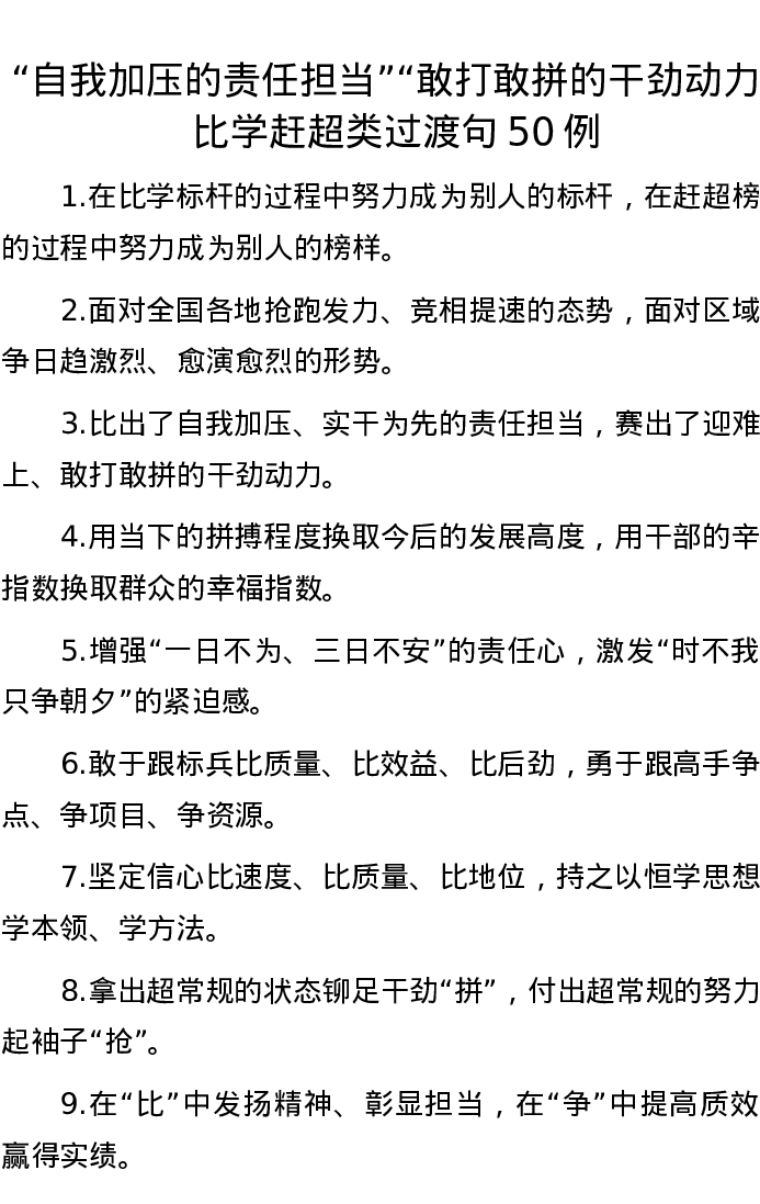 “自我加压的责任担当”“敢打敢拼的干劲动力”:比学赶超类过渡句50例