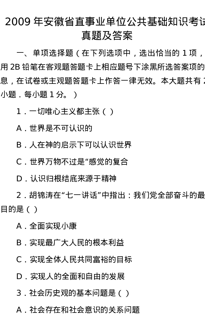 2009年安徽省直事业单位公共基础知识考试真题及答案