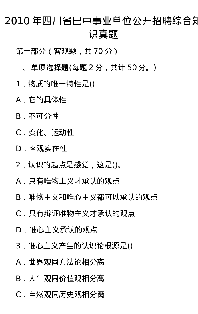 2010年四川省巴中事业单位公开招聘综合知识真题