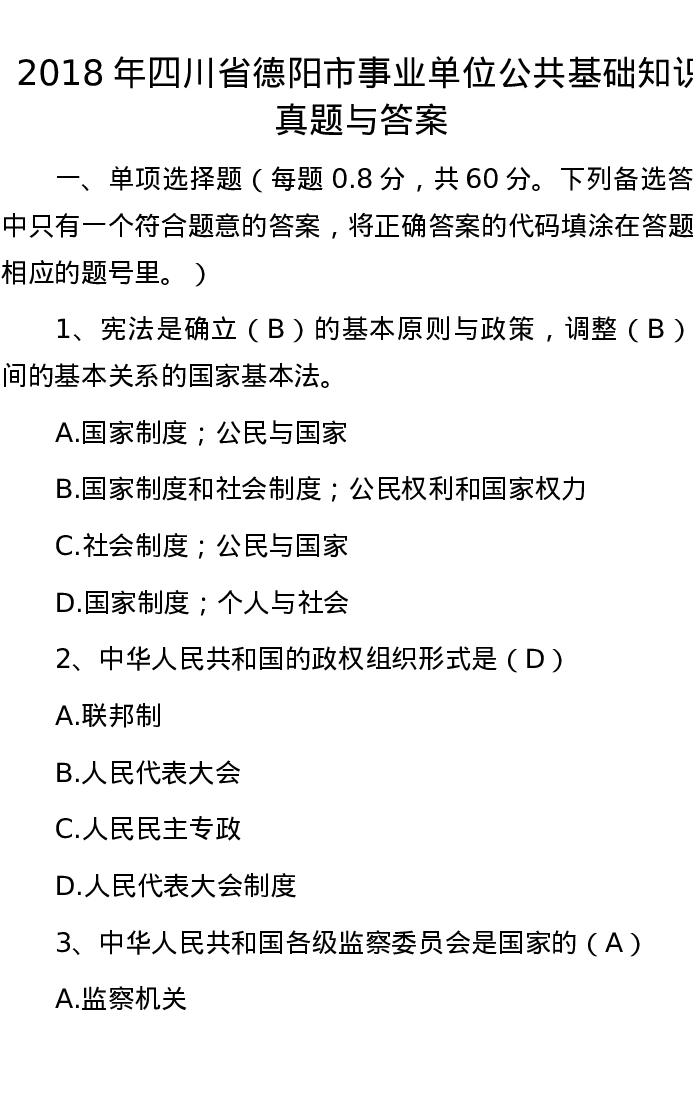 2018年四川省德阳市事业单位公共基础知识真题与答案