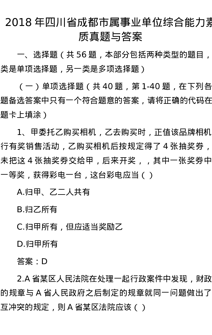 2018年四川省成都市属事业单位综合能力素质真题与答案