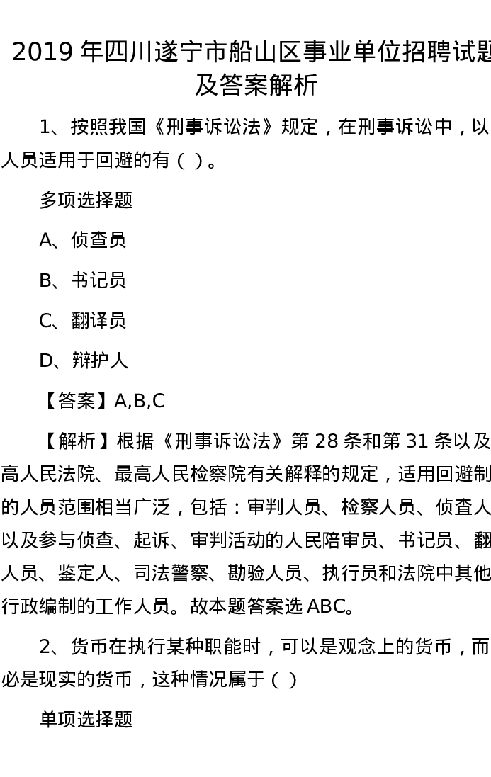 2019年四川遂宁市船山区事业单位招聘试题及答案解析