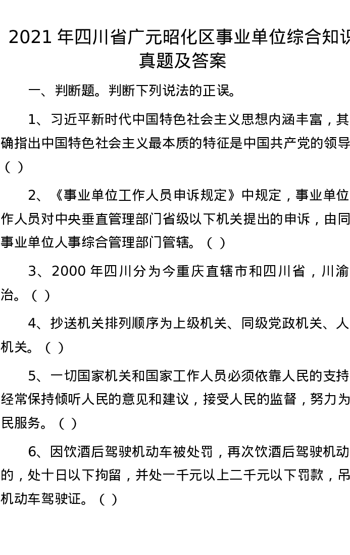 2021年四川省广元昭化区事业单位综合知识真题及答案