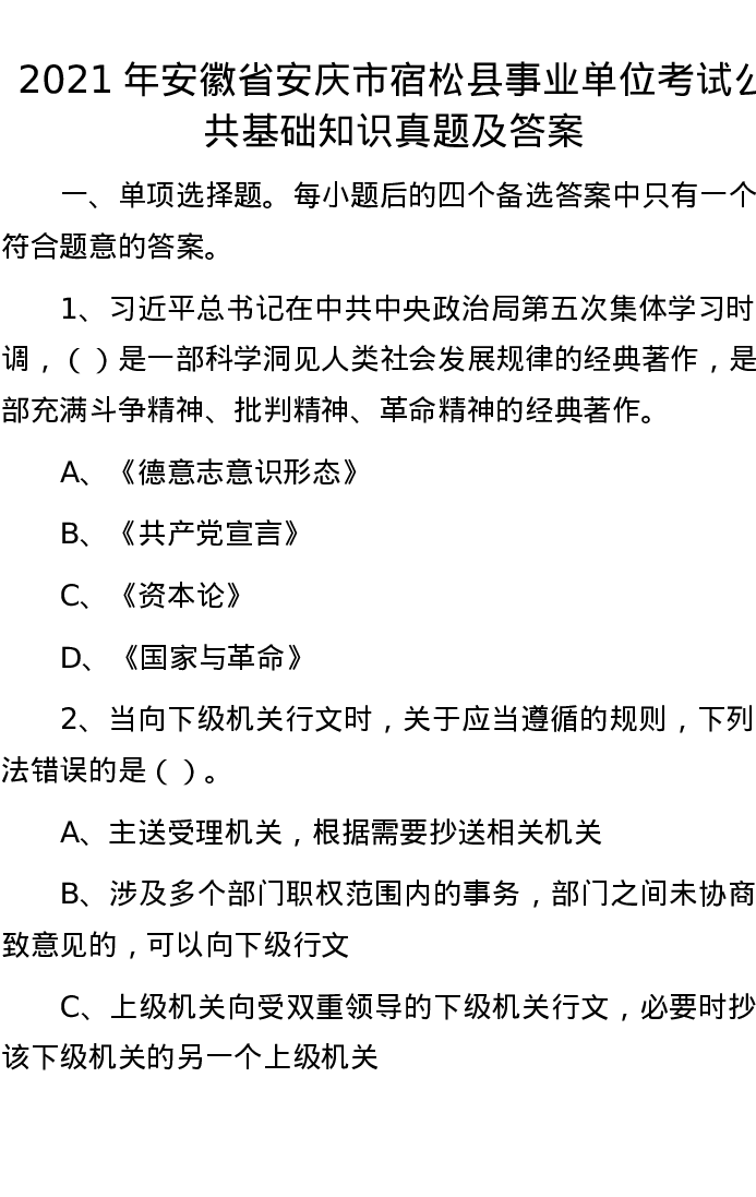 2021年安徽省安庆市宿松县事业单位考试公共基础知识真题及答案