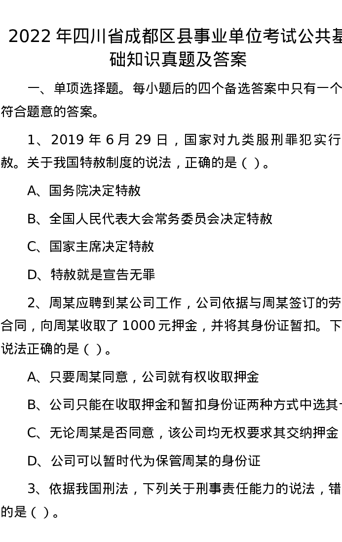 2022年四川省成都区县事业单位考试公共基础知识真题及答案