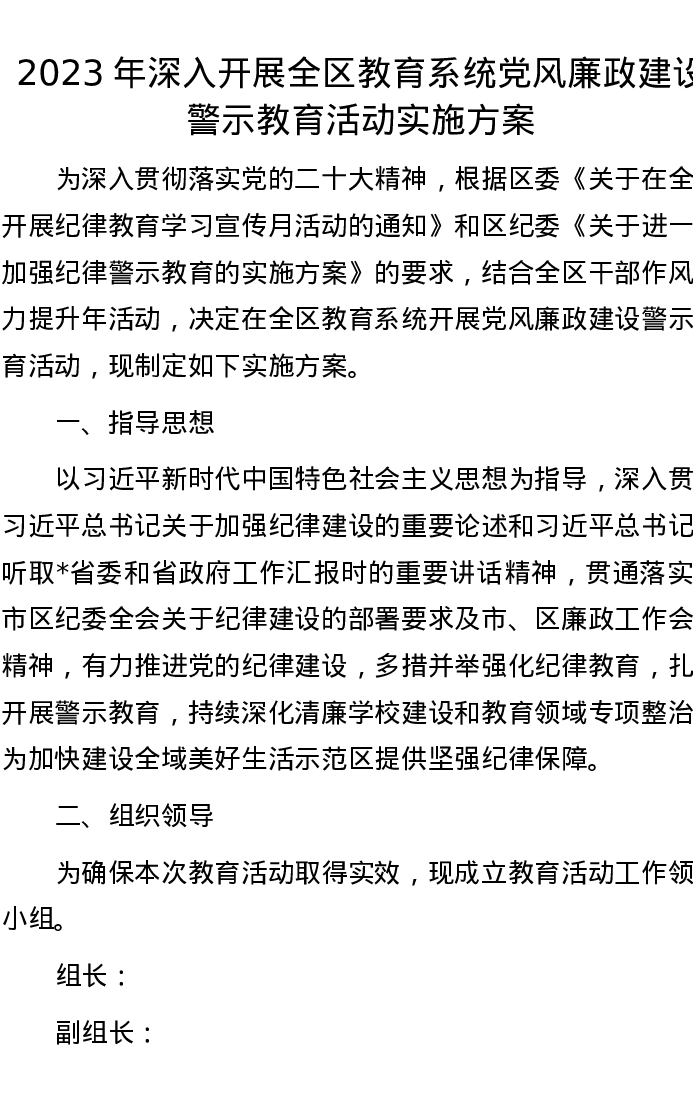 2023年深入开展全区教育系统党风廉政建设警示教育活动实施方案