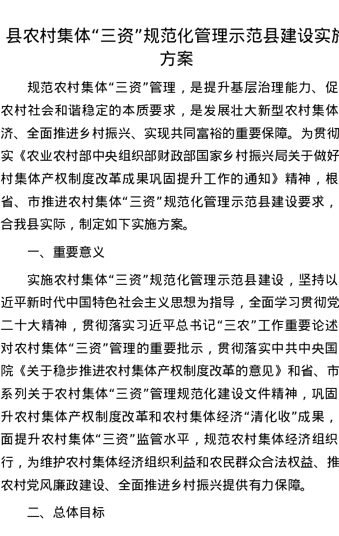 县农村集体“三资”规范化管理示范县建设实施方案
