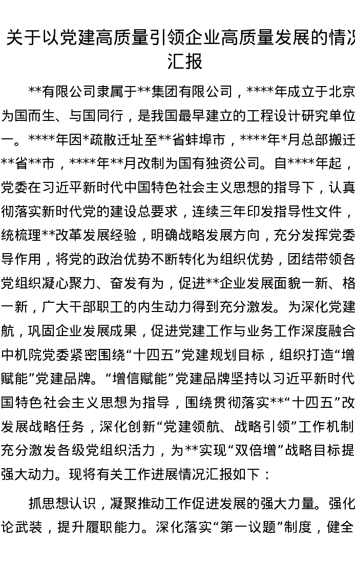 关于以党建高质量引领企业高质量发展的情况汇报