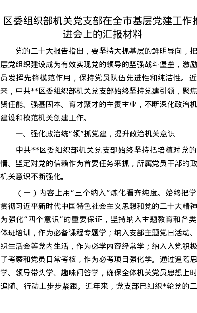区委组织部机关党支部在全市基层党建工作推进会上的汇报材料