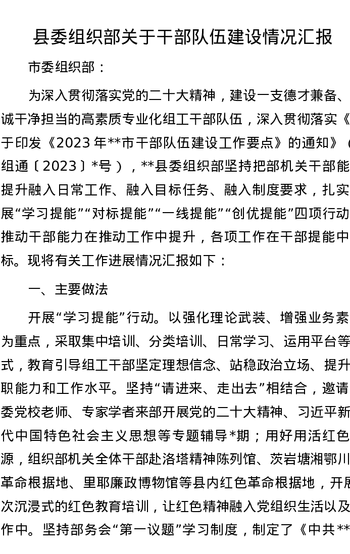 县委组织部关于干部队伍建设情况汇报