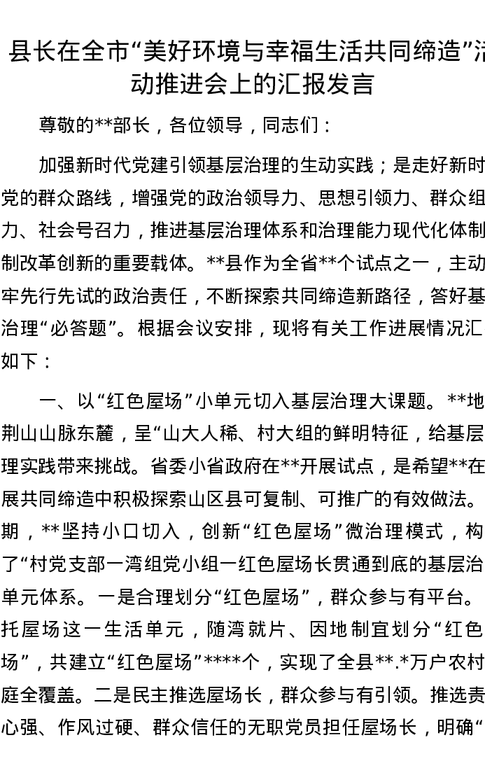 县长在全市“美好环境与幸福生活共同缔造”活动推进会上的汇报发言