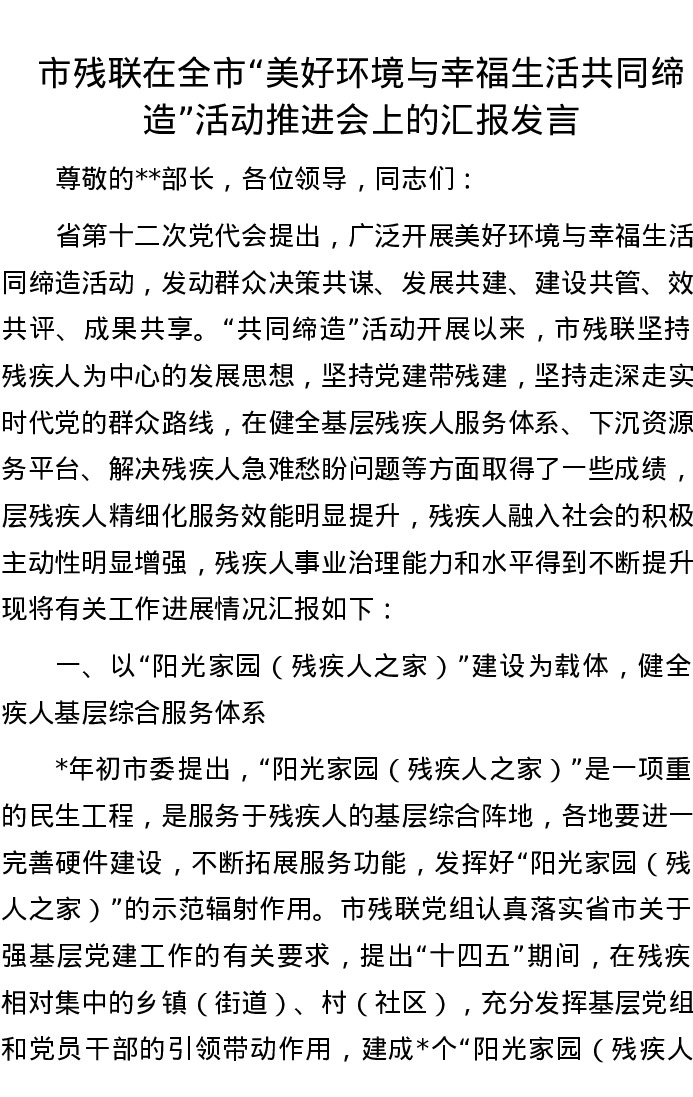 市残联在全市“美好环境与幸福生活共同缔造”活动推进会上的汇报发言