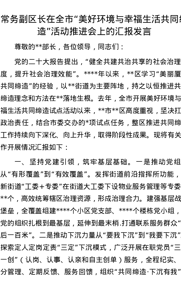 常务副区长在全市“美好环境与幸福生活共同缔造”活动推进会上的汇报发言