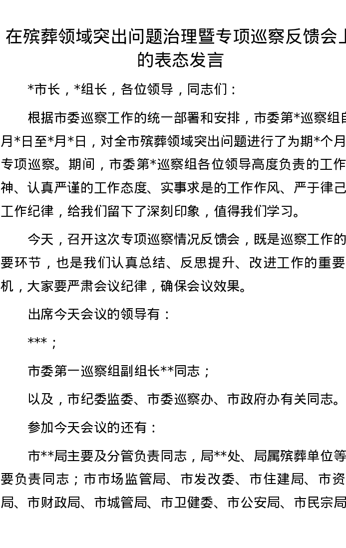 在殡葬领域突出问题治理暨专项巡察反馈会上的表态发言