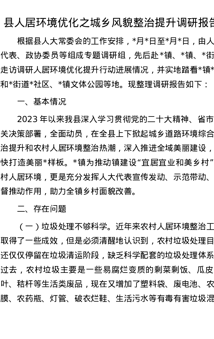 县人居环境优化之城乡风貌整治提升调研报告