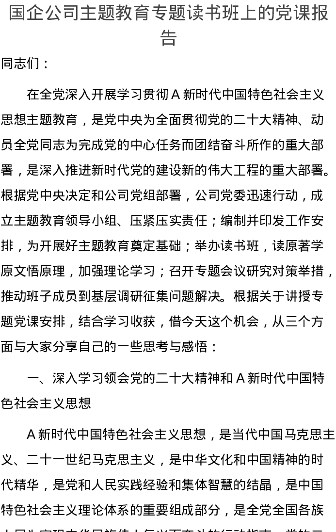 国企公司主题教育专题读书班上的党课报告(特色社会主义思想)