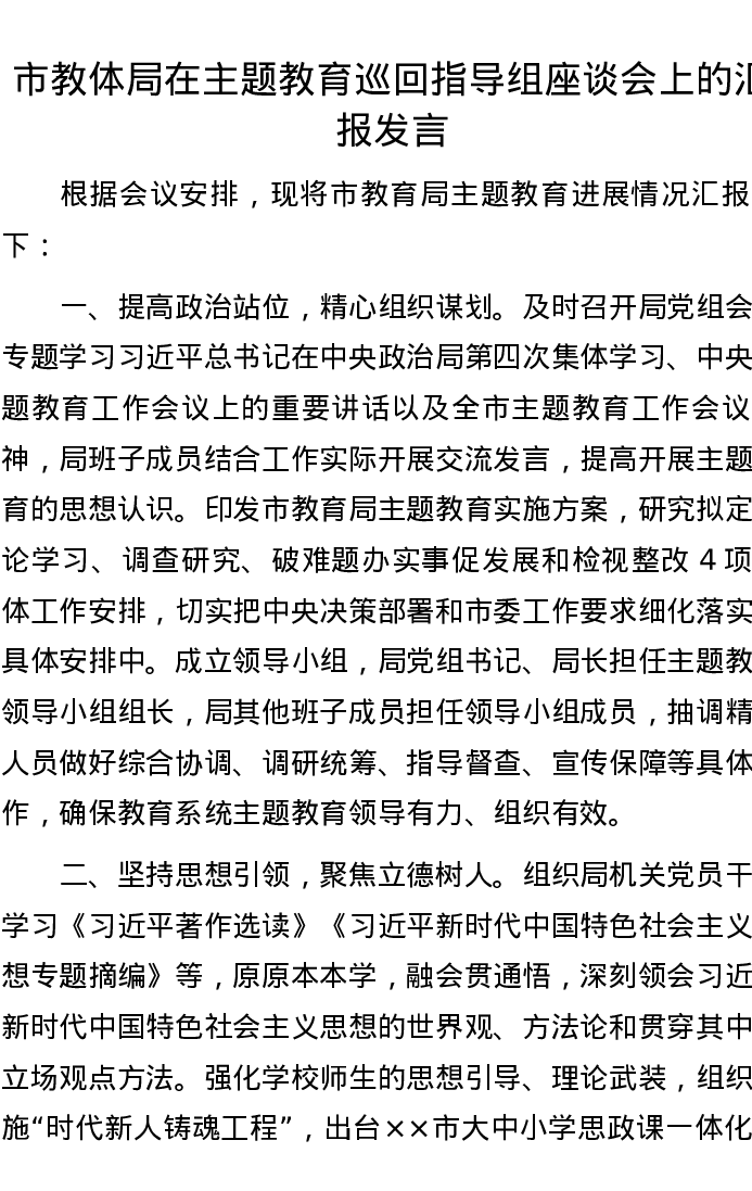 市教体局在主题教育巡回指导组座谈会上的汇报发言