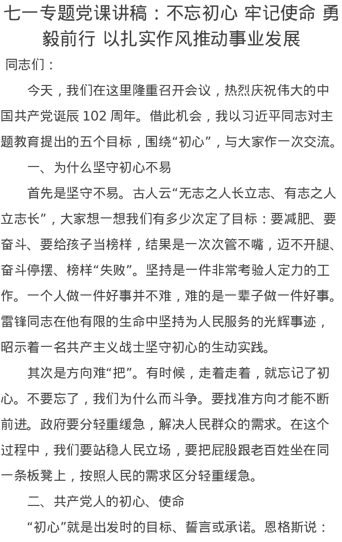 七一专题党课讲稿 不忘初心 牢记使命 勇毅前行 以扎实作风推动事业发展
