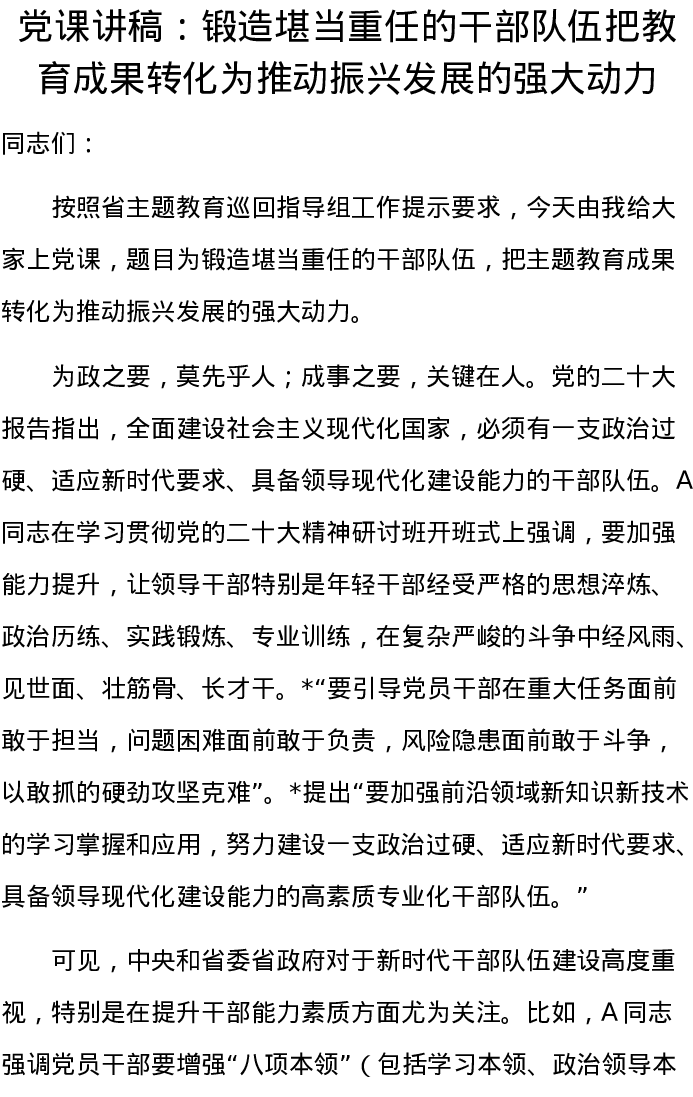 党课讲稿:锻造堪当重任的干部队伍把教育成果转化为推动振兴发展的强大动力