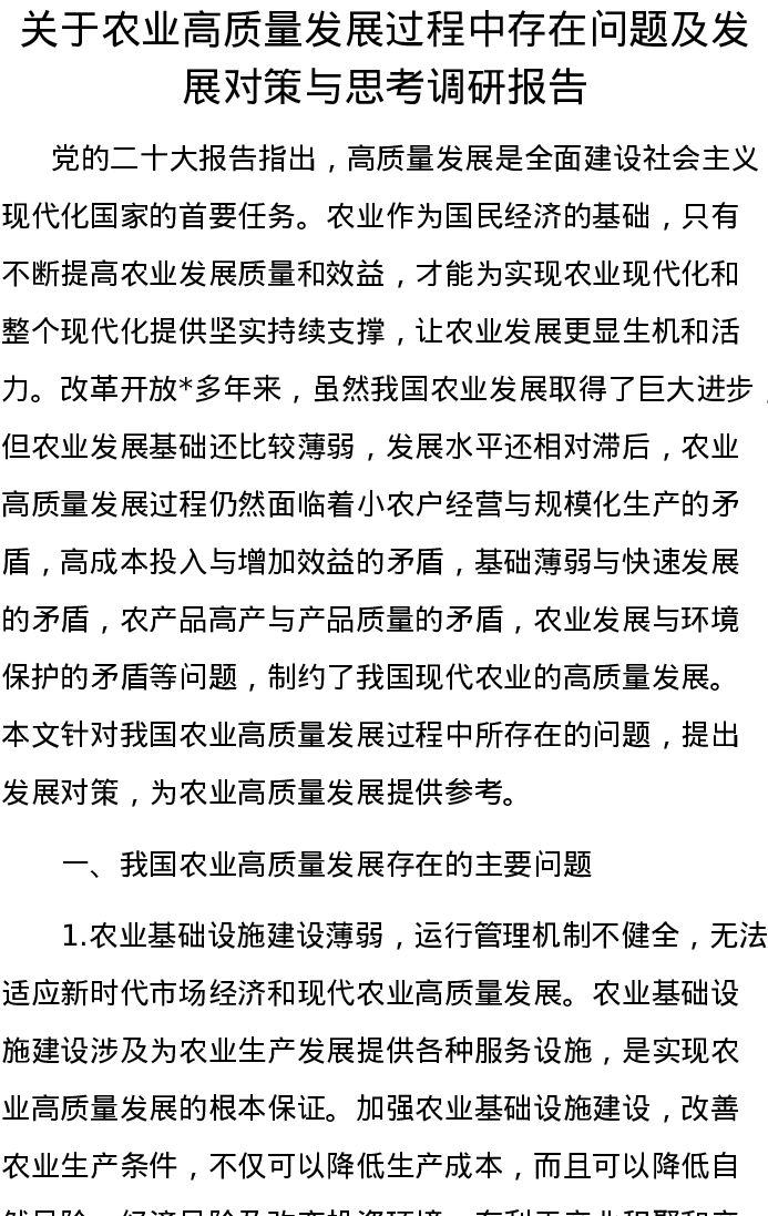 关于农业高质量发展过程中存在问题及发展对策与思考调研报告