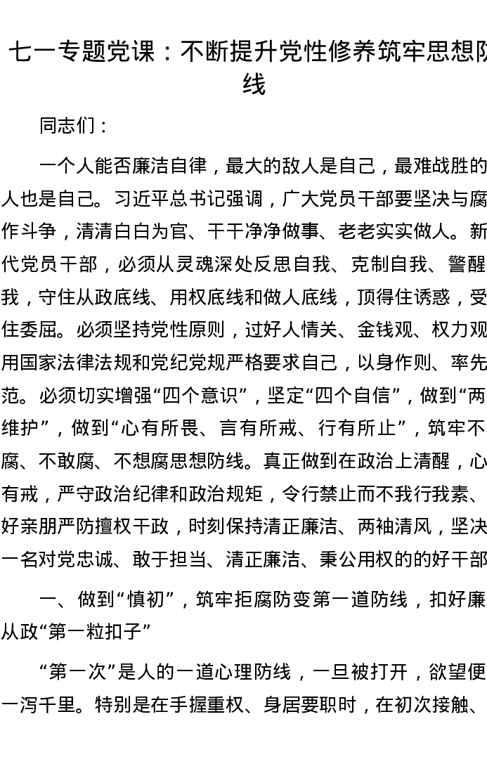 七一专题党课:不断提升党性修养 筑牢思想防线