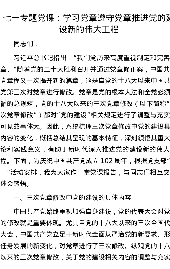 七一专题党课:学习党章 遵守党章 推进党的建设新的伟大工程