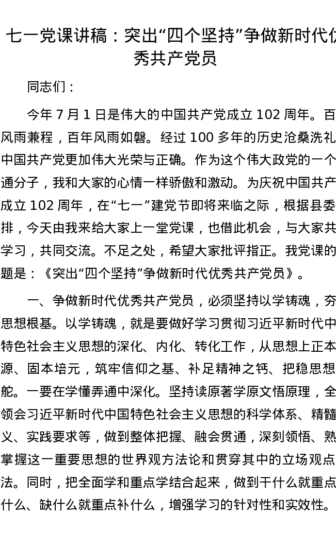七一党课讲稿:突出“四个坚持”争做新时代优秀共产党员