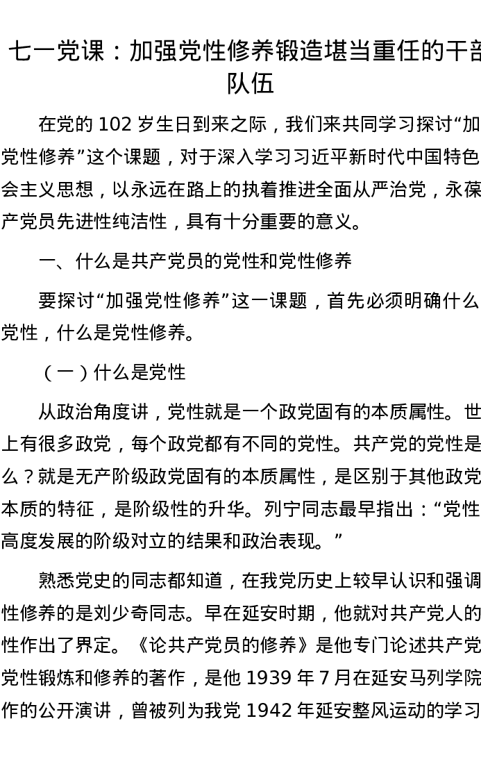 七一党课:加强党性修养锻造堪当重任的干部队伍