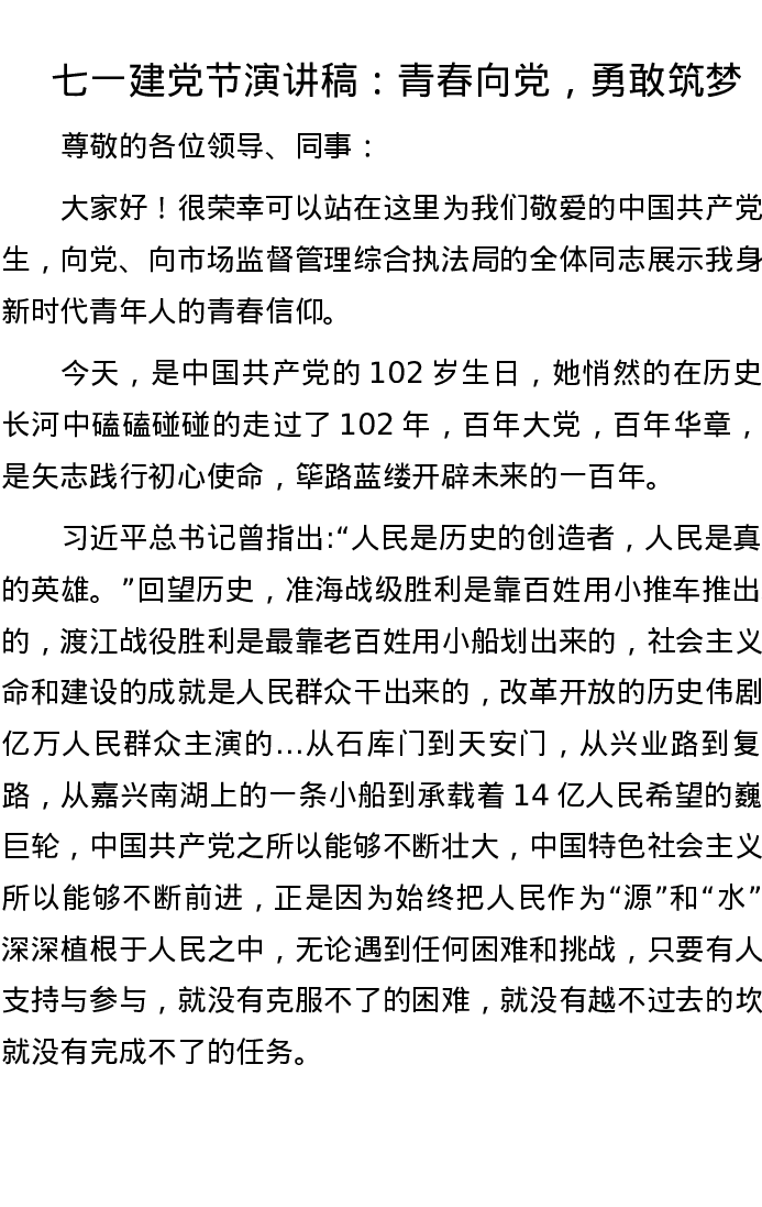 七一建党节演讲稿:青春向党,勇敢筑梦