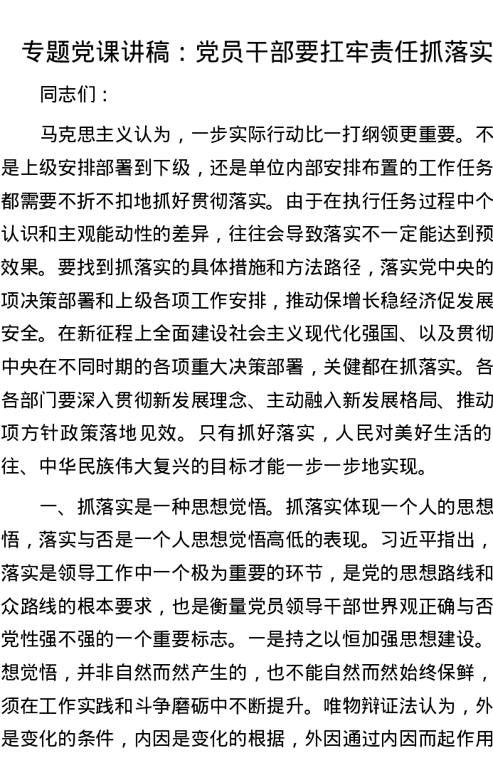 专题党课讲稿:党员干部要扛牢责任抓落实