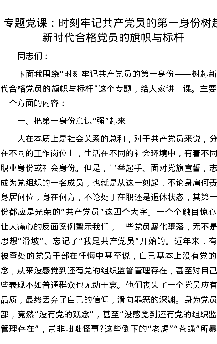 专题党课:时刻牢记共产党员的第一身份 树起新时代合格党员的旗帜与标杆