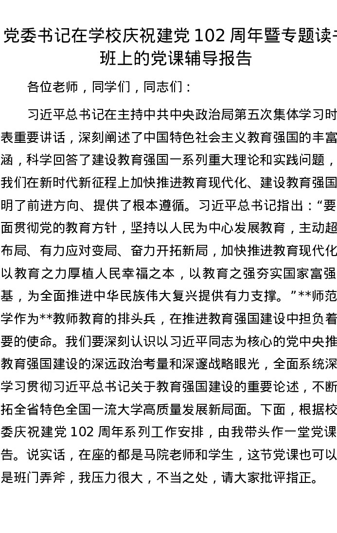 党委书记在学校庆祝建党102周年暨专题读书班上的党课辅导报告