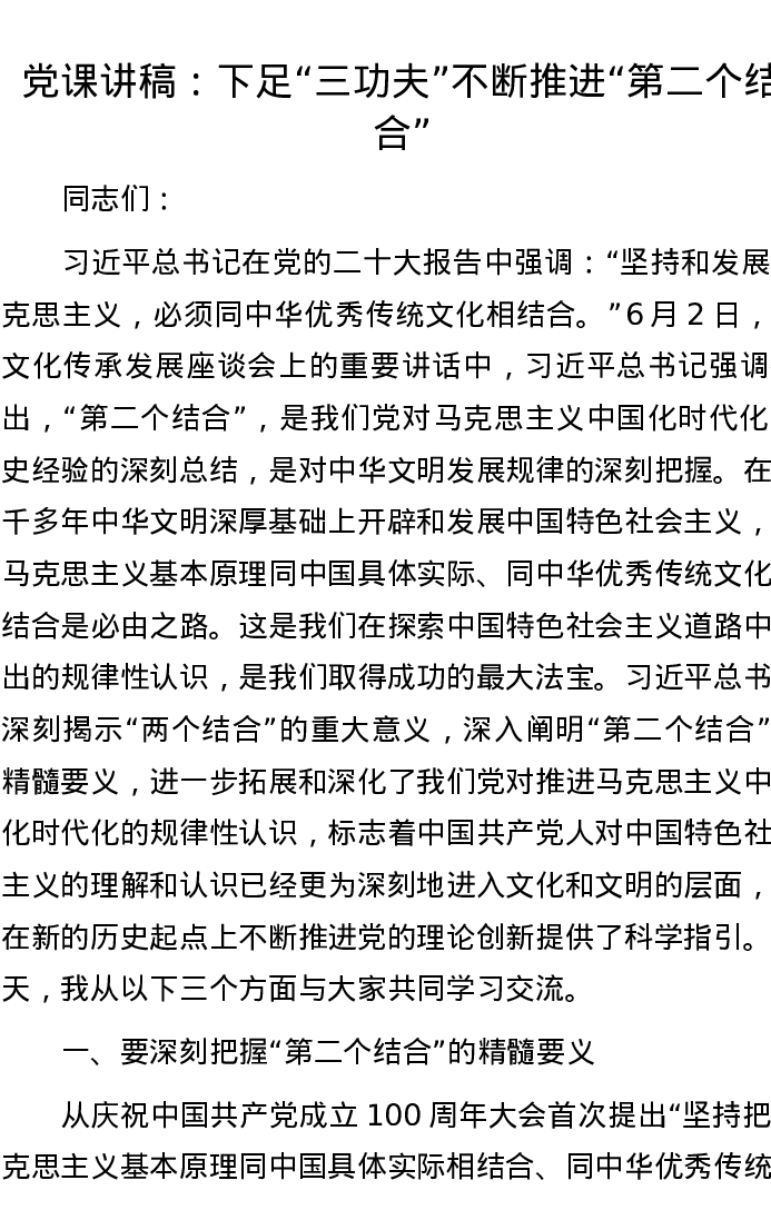党课讲稿:下足“三功夫” 不断推进“第二个结合”