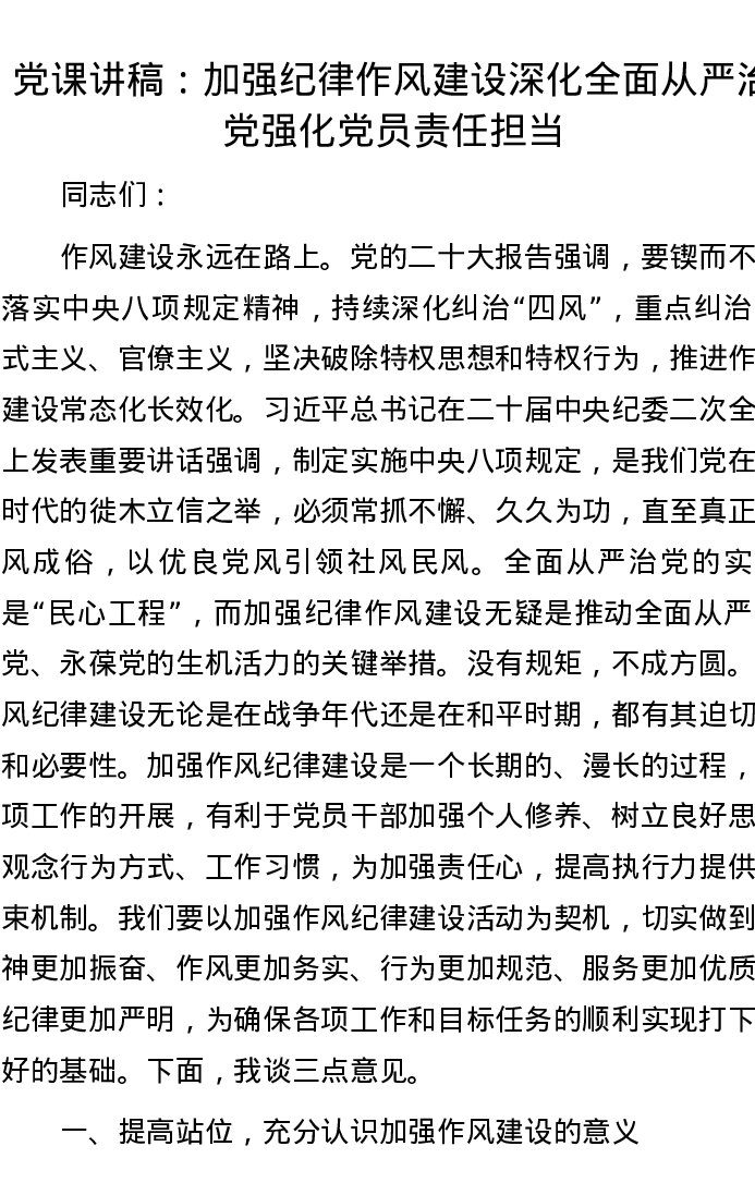 党课讲稿:加强纪律作风建设 深化全面从严治党 强化党员责任担当
